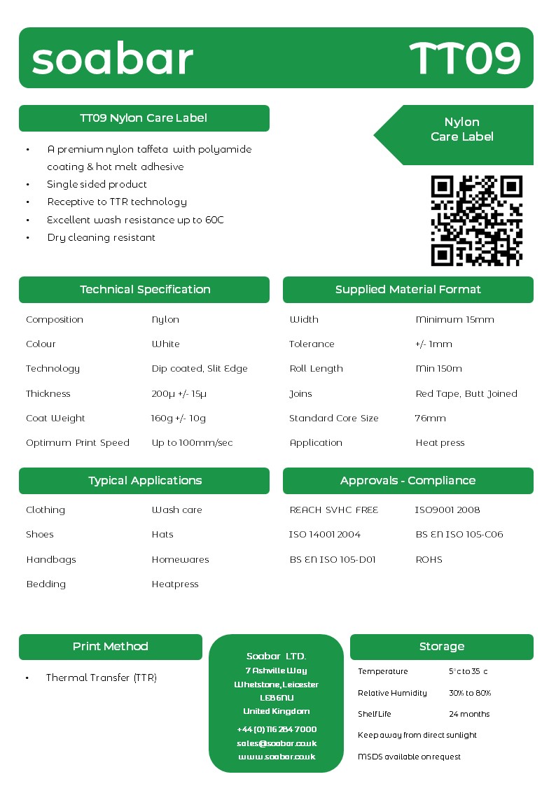 Our TT09 is a premium nylon taffeta with a polyamide coating and hot melt adhesive and is well suited to producing your own care labels on demand for the toughest of environments.